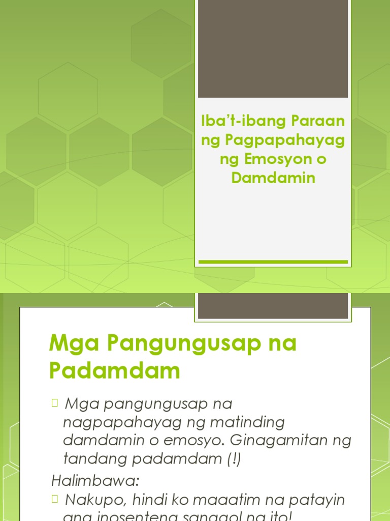 222021 Ibat-ibang Paraan ng Pagpapahayag ng Emosyon o Damdamin Padamdam at Maikling Sambitla Isang uri ng pangungusap nagpapahayag ng matinding damdamin o emosyon. Ang mga katangian ng isang tao ang mga ito ay positibong pisikal o asal na ugali na tumutukoy sa mga tao. Sarbey - ginagamit para sukatin ang umiiral na pangyayari nang hindi nagtatanong kung bakit.