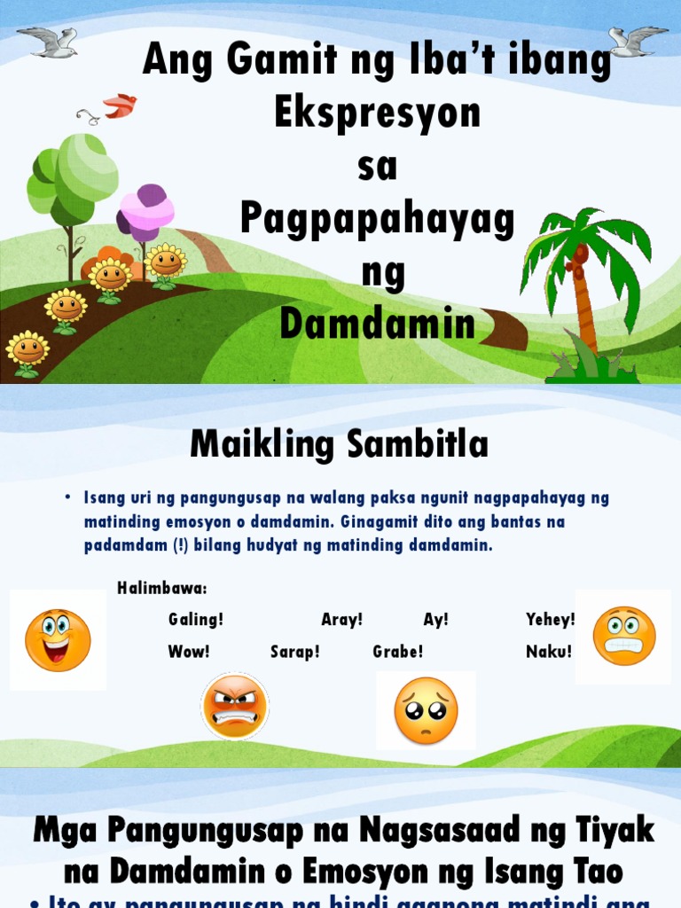 Narito ang mga halimbawa. PADAMDAM AT MAIKLING SAMBITLA Isang uri ng pangungusap na walang paksang nagpapahayag ng matinding damdamin. 2052016 Filipino 9 Ibat-ibang Paraan ng Pagpapahayag ng Emosyon o Damdamin 1.
